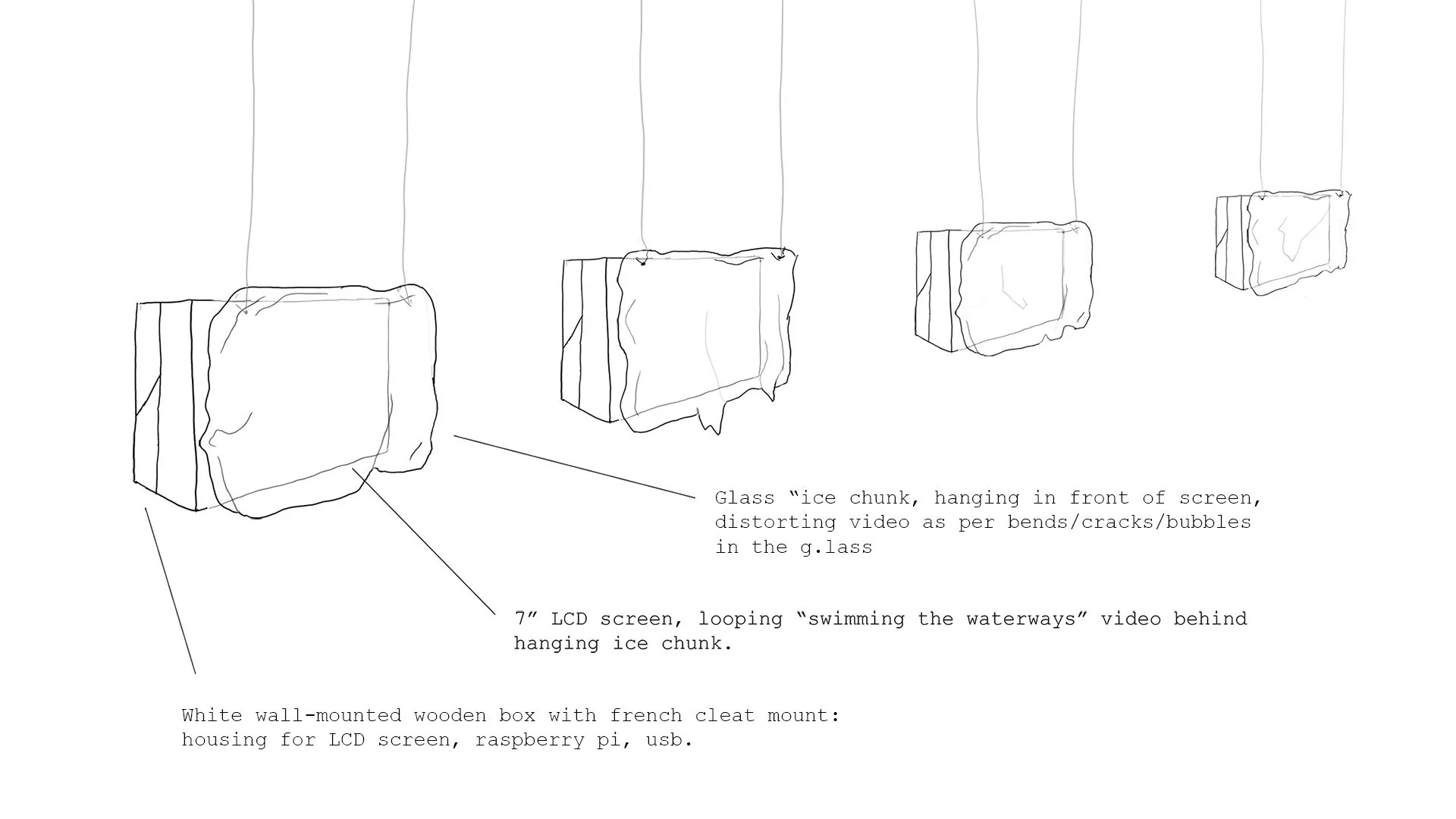 **The following images are the proposed sculptural works. In addition there will be two video works not pictured below: one circular floor projection with glass hoop, with video depicting the “collection of heat”; and, a large wall projection depicting the “transfer of heat” on the shoreline. The second image (four glass pieces formed as ice hanging over small video screens) will depict the “swimming the waterways” element of the story.