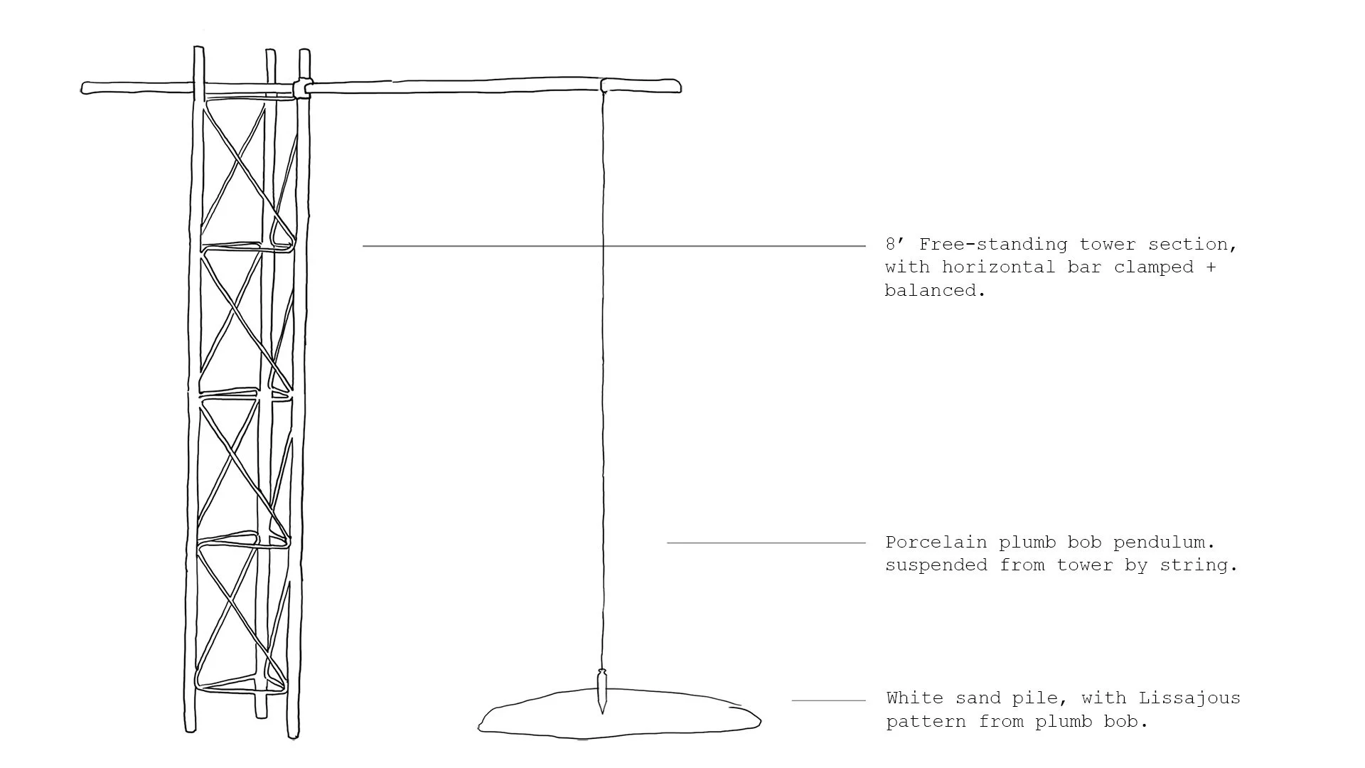 The final works are informed by glacial surveying and climate monitoring equipment. The first is a pendulum hanging at equilibrium over patterns it traced in sand. The pendulum’s stand references snow-depth monitoring stations and the pendulum is a porcelain cast plumb bob. The patterns drawn in the sand by the pendulum can be read as modelling the system of collective responsibility: traces of the collective forces acting upon the pendulum until it reaches equilibrium. The second reference is a surveyor tripod as the light source for the banner.