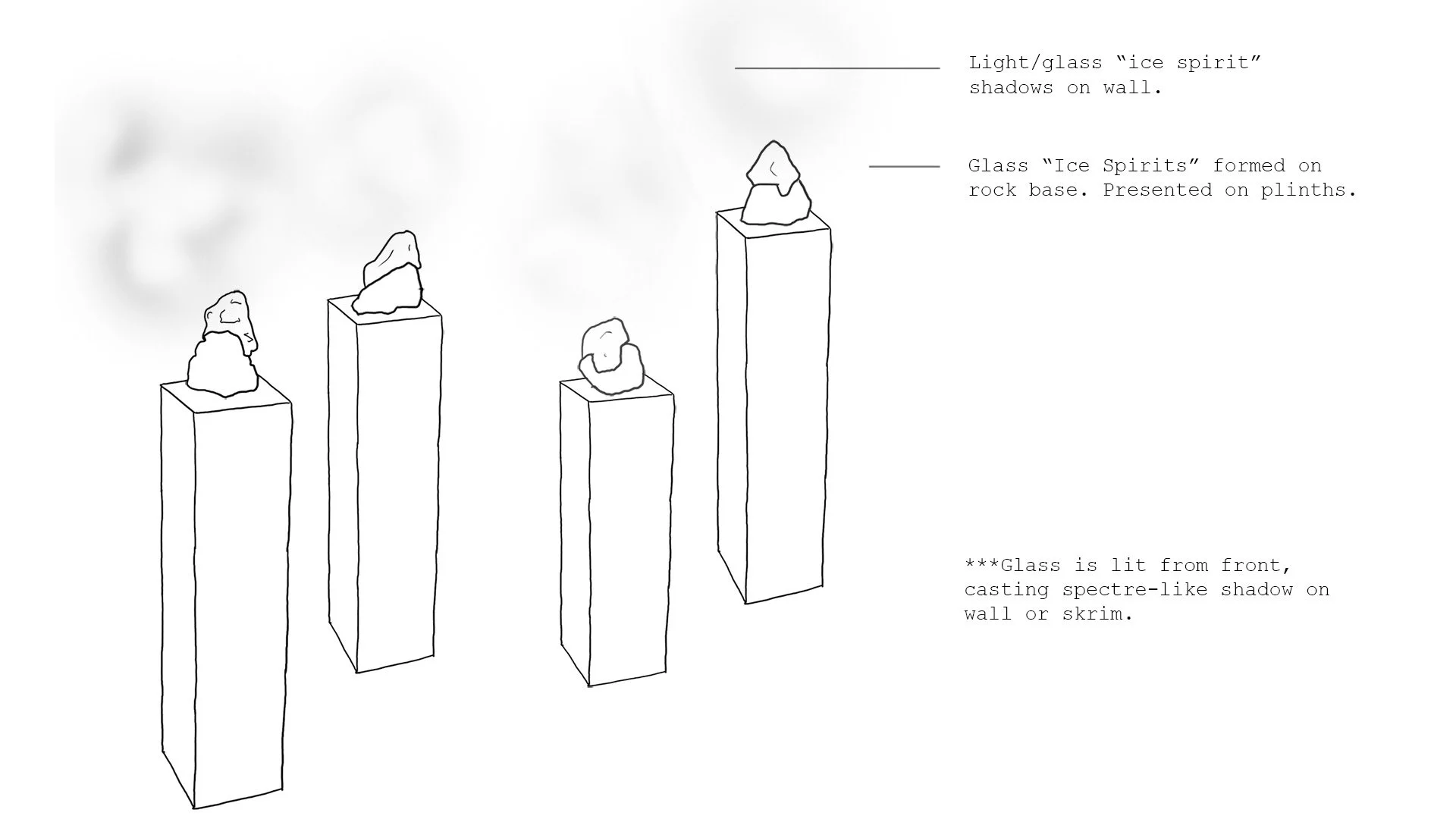 “The Ice Spirits” a a series of glass objects formed on rock bases. They are inspired by the unique ice formations on Lake Baikal in Siberia, the deepest, oldest, and most voluminous lake on earth. Baikal is also one of the world’s most rapdly warming regions, threatening an ecosystem of plants and animals unique to the lake. Researchers predict Baikal’s glaciers will become rock glaciers - landforms consisting of rock debris with interstitial ice. To a certain extent, the rocks will act as insulation to the ice. In the Icehouse story, “The Ice Spirits” have been held by the rocks until a time when ice can thrive again. Lit from the front, they cast a spectre-like reflection on the wall behind them.