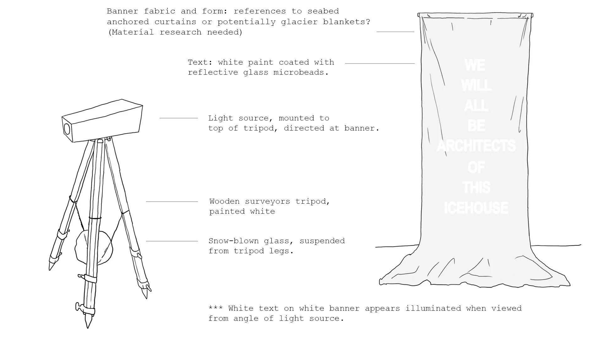 The banner artworks reference current climate change interventions that block, reflect, reroute, etc. heat from the sun and warming oceans. Ie. a white vertical banner with white text “We Will All Be Architects of this Icehouse”, is coated `in reflective glass microspheres being researched by the Arctic Ice Project. The form / material may draw from the design for seabed anchored curtains, or glacier blankets. Directed at the banner is a light source mounted on a land surveyors tripod. The light illuminates the reflective text when viewed from the angle of the light. In the speculative future-time of the work, these geoengineered technologies have become vestigial, and now function as objects that hold stories of how we have been moving through climate change, towards a more ecologically just future where polar ice and glaciers can thrive.